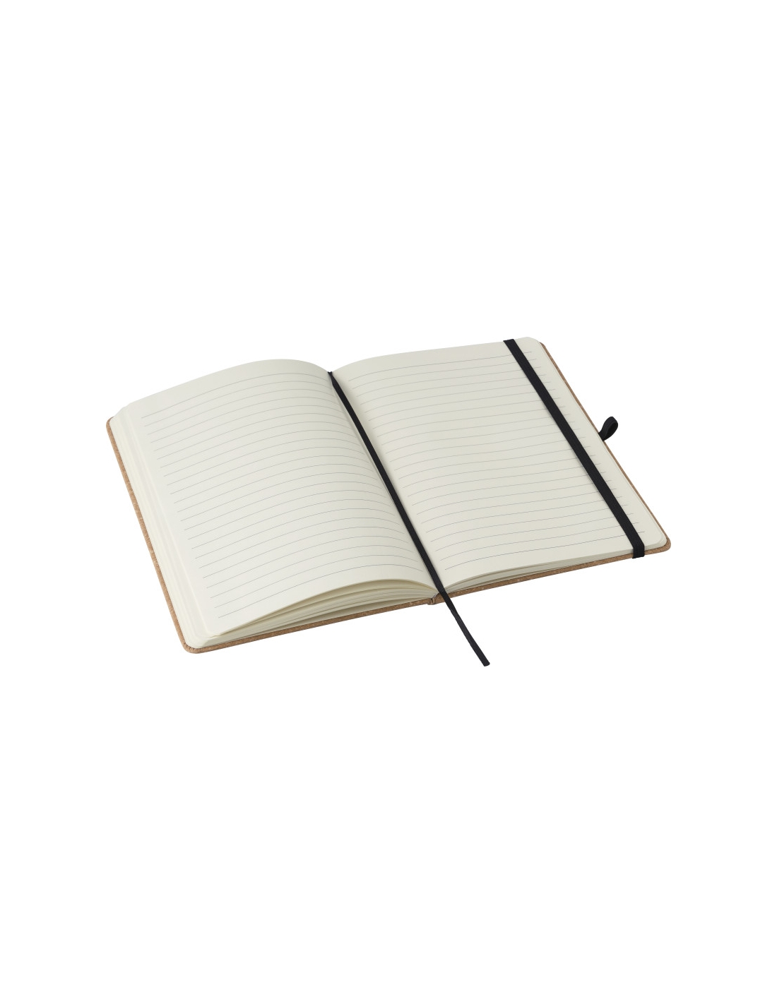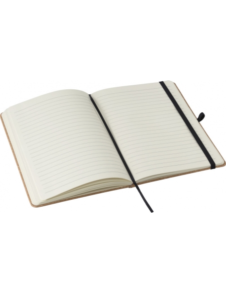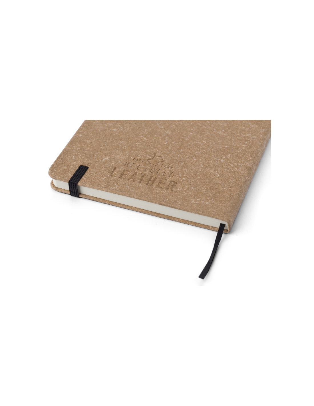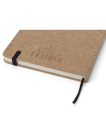 Libreta de piel reciclada (aprox. A5) con 200 páginas a rayas. Con elástico. cinta marcapáginas y portabolígrafo. En la parte trasera lleva termograbado el logo 'reciclado'.