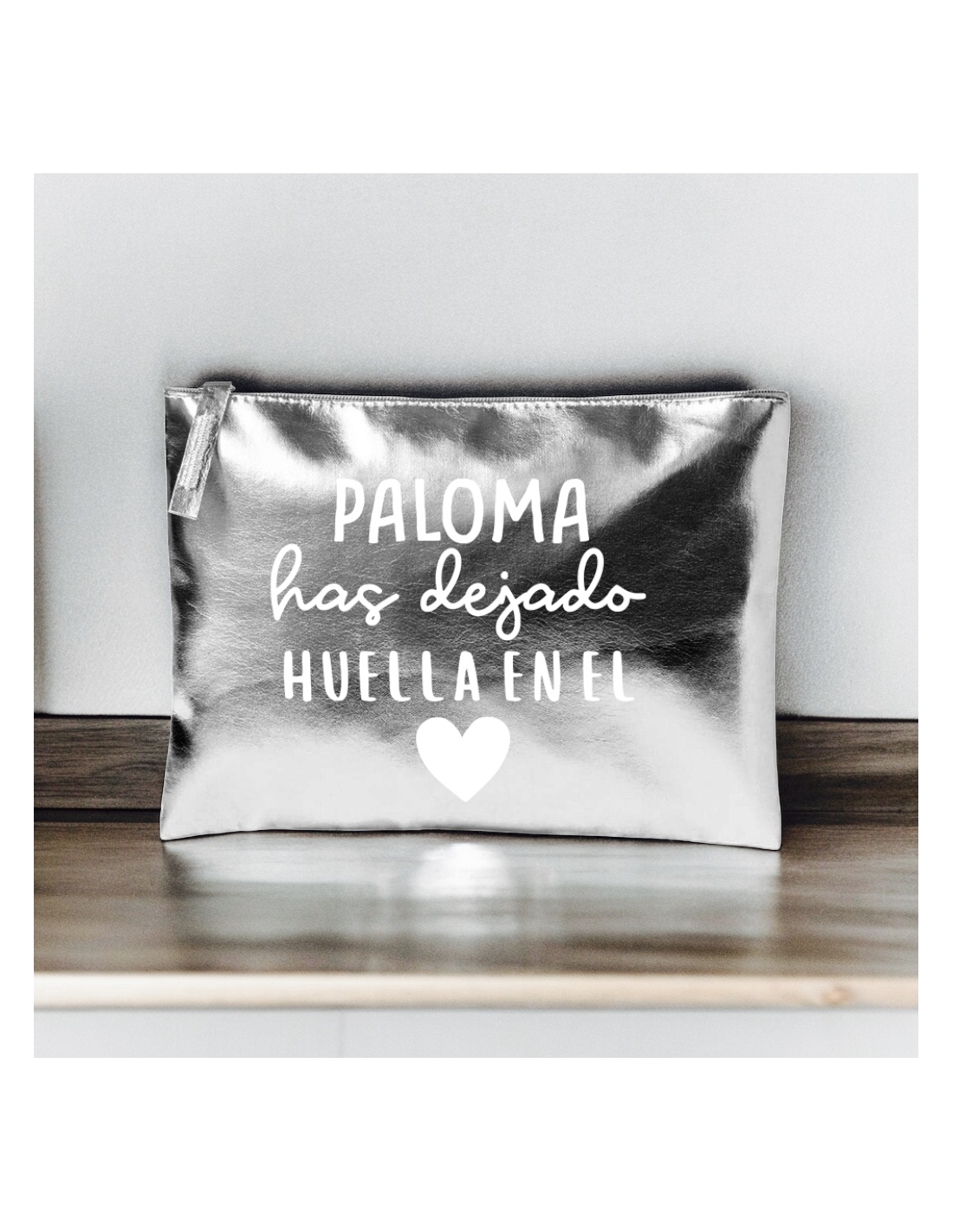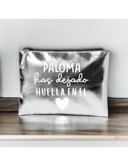 Neceser metalizado con frase (NOMBRE has dejado huella en el corazón), medida 21x15cm (1pc).