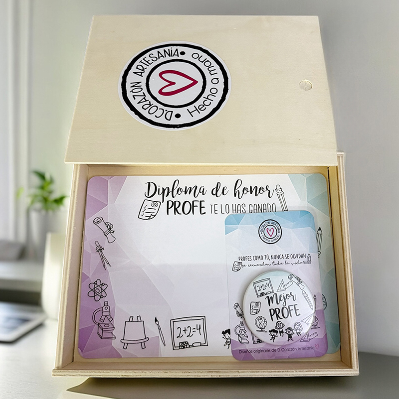 -Presentado en caja de madera, con diploma para que los niños escriban sus nombres y pin mejor profe.