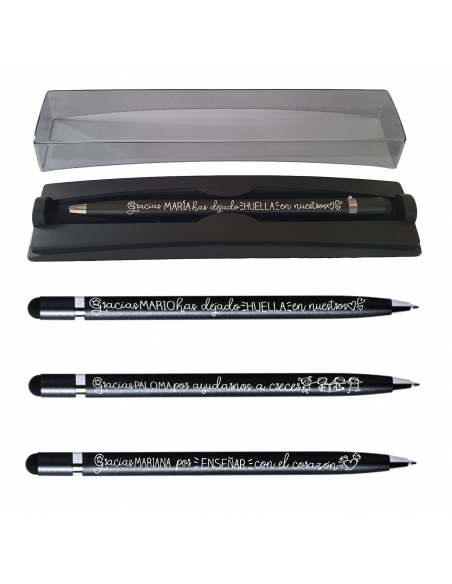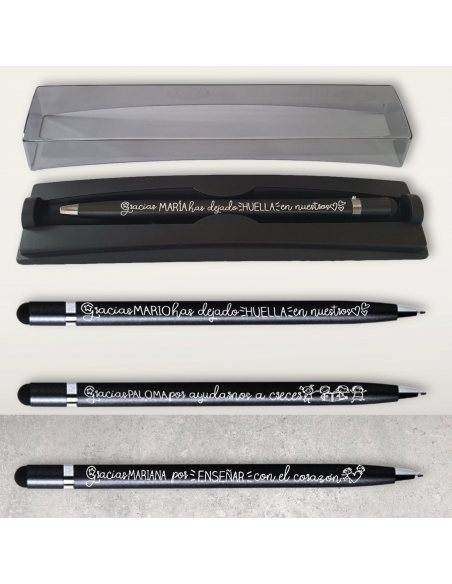 Bolígrafo de aluminio con puntero táctil. Tinta azul. Este bolígrafo destaca por su delicadeza y sofisticación. Cuenta con un cabezal especial para pantallas táctiles, lo que lo convierte en la herramienta perfecta para navegar en dispositivos electrónicos sin dejar huellas. Su mecanismo de apertura giratoria permite acceder fácilmente a la punta de escritura.
