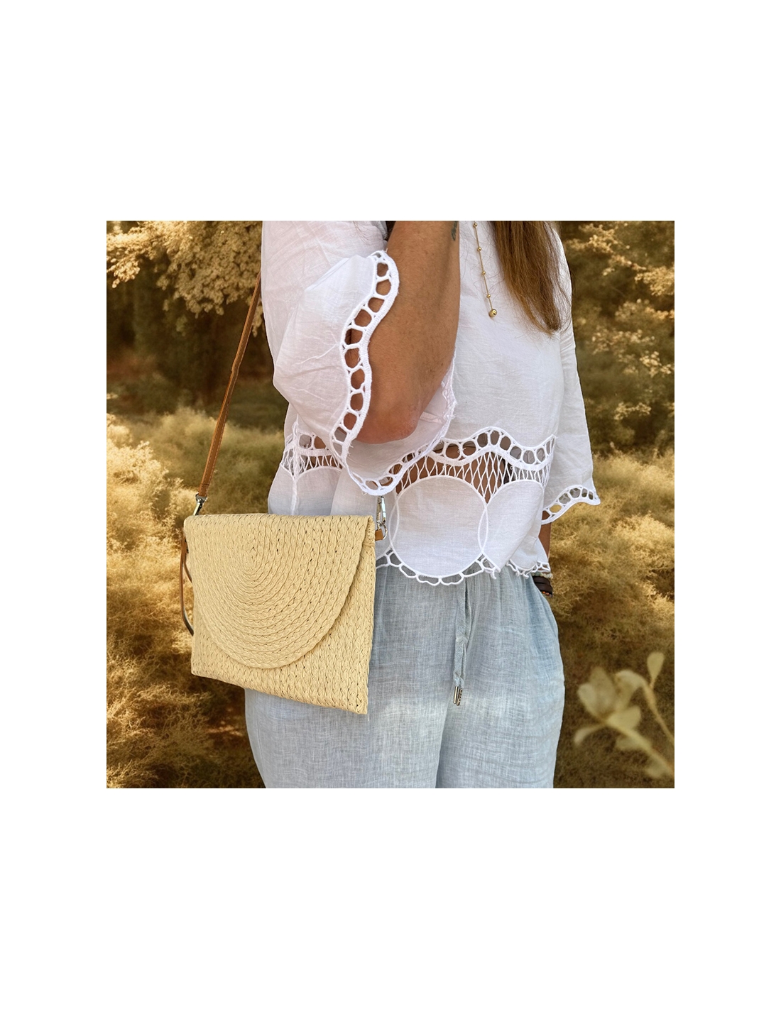 Bolso en material de paja tejida, 400 g/m2 en combinación con poli piel en el asa de alta resistencia y duración. Resistencia hasta 3 kg de peso.