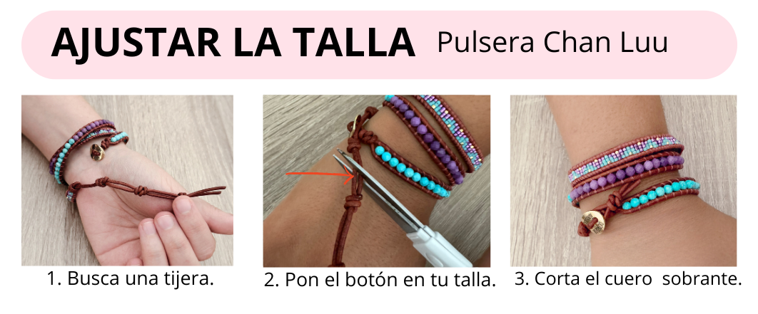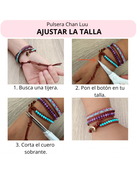 El cierre de la Chan Luu, tiene un botón de acero inoxidable (hipoalergénico). A su vez la terminación tiene tres orificios donde introducir el botón y ajustar en mayor o menor medida la pulsera, después de introducir el botón en la talla correcta, cortar el sobrante con unas tijeras.
