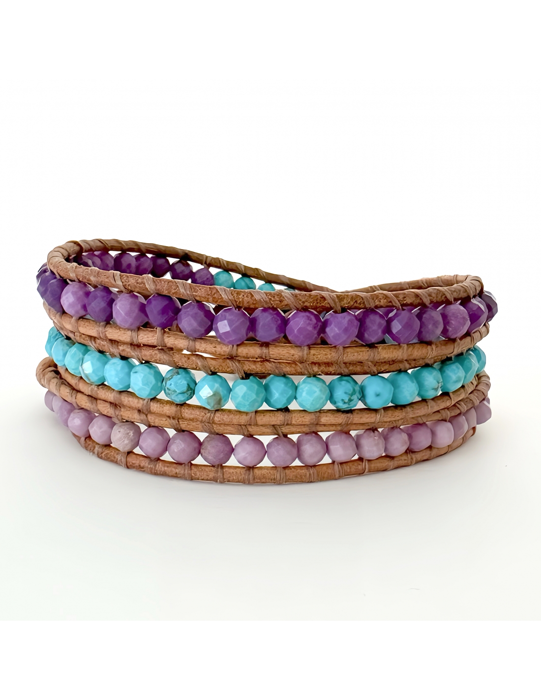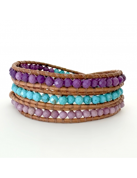 Pulsera estilo Chan Luu, cosida a mano, bola a bola, sobre cuero. Una pulsera da tres vueltas sobre la muñeca.
