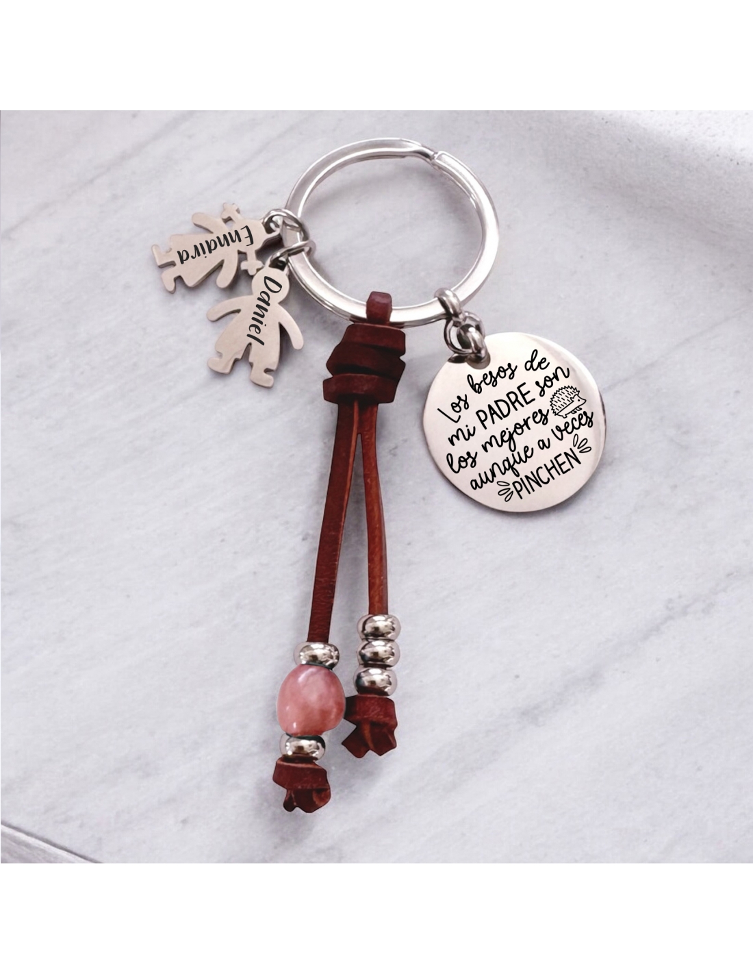 Llavero personalizado con nombres, acero y cuero con frase (los besos de mi PADRE son los mejores aunque a veces PINCHEN).