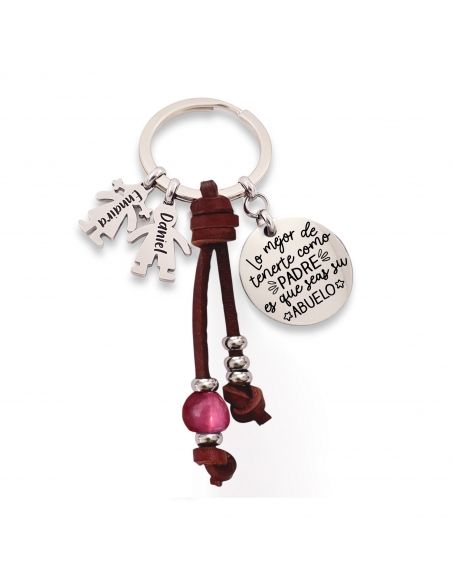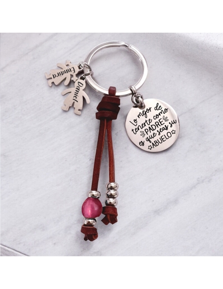 Llavero personalizado con nombres, acero y cuero con frase (Lo mejor de tenerte como PADRE es que seas su ABUELO).
