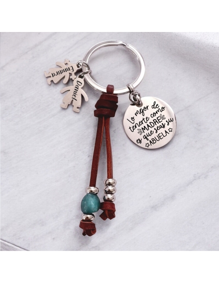 Llavero personalizado con nombres, acero y cuero con frase (Lo mejor de tenerte como MADRE es que seas su ABUELA).