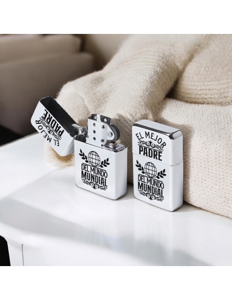 Sorprende a tu papá o abuelo con este elegante mechero tipo Zippo personalizado con frases especiales para el Día del Padre. Su diseño metálico de alta calidad ofrece un estilo clásico y sofisticado, ideal como recuerdo único y significativo.