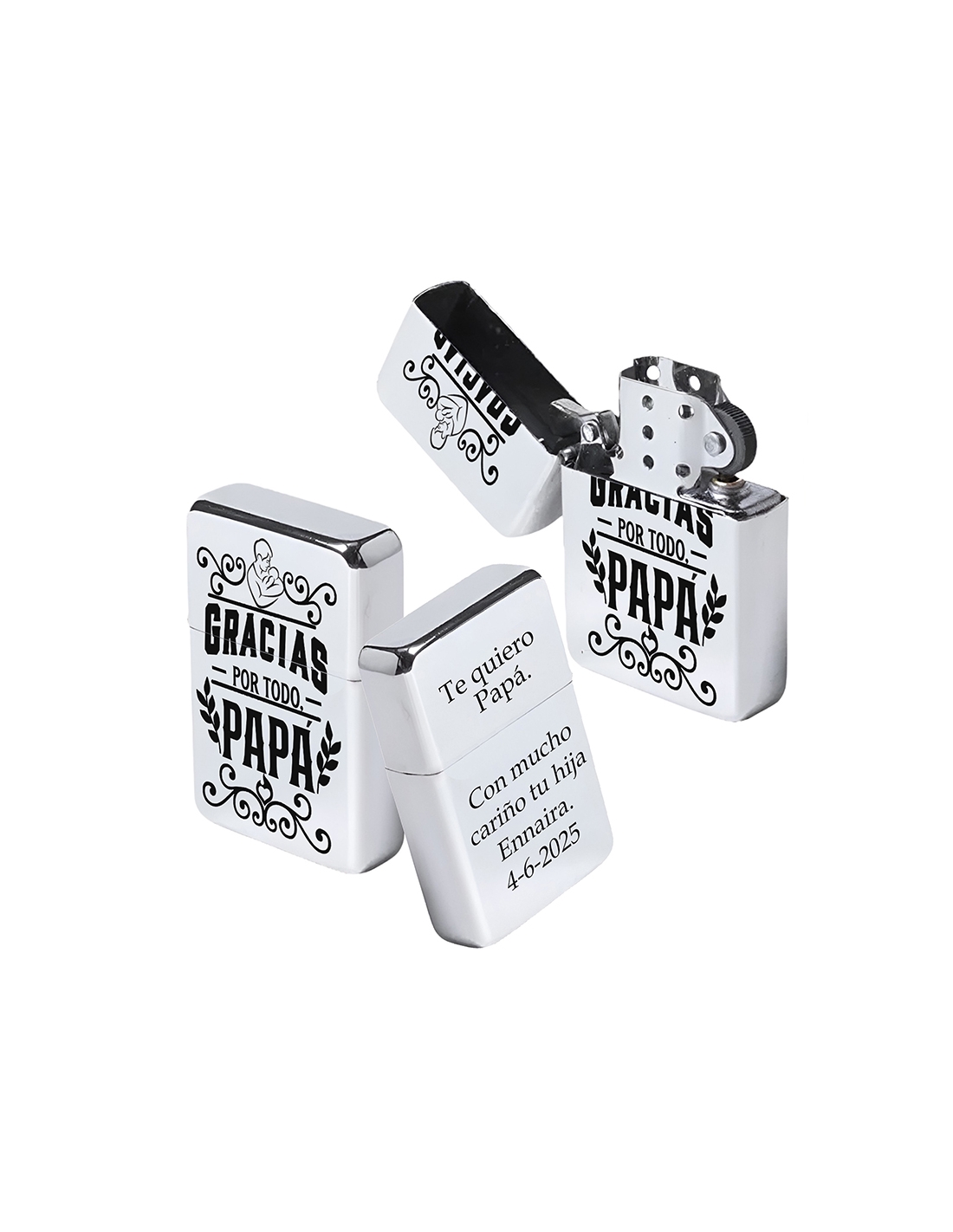 Sorprende a tu papá o abuelo con este elegante mechero tipo Zippo personalizado con frases especiales para el Día del Padre. Su diseño metálico de alta calidad ofrece un estilo clásico y sofisticado, ideal como recuerdo único y significativo.