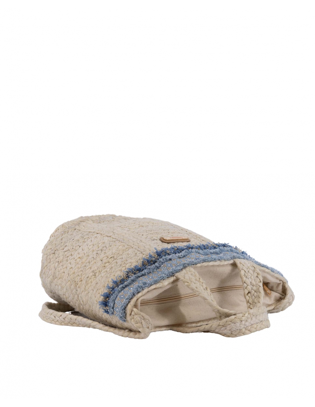 Bolso grande fabricado en yute, con cierre de cremallera en yute, forro interior de al godón con bolsillo interior, asa estilo tote y asa bandolera de yute. Decorado con pasamanería denim rasgado con brillantes y fleco estilo pom pon en azul y metal, logo clásico en dorado.
