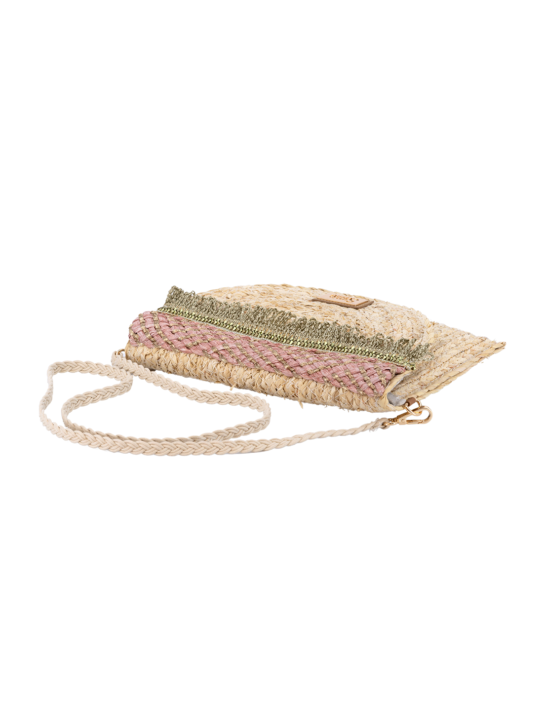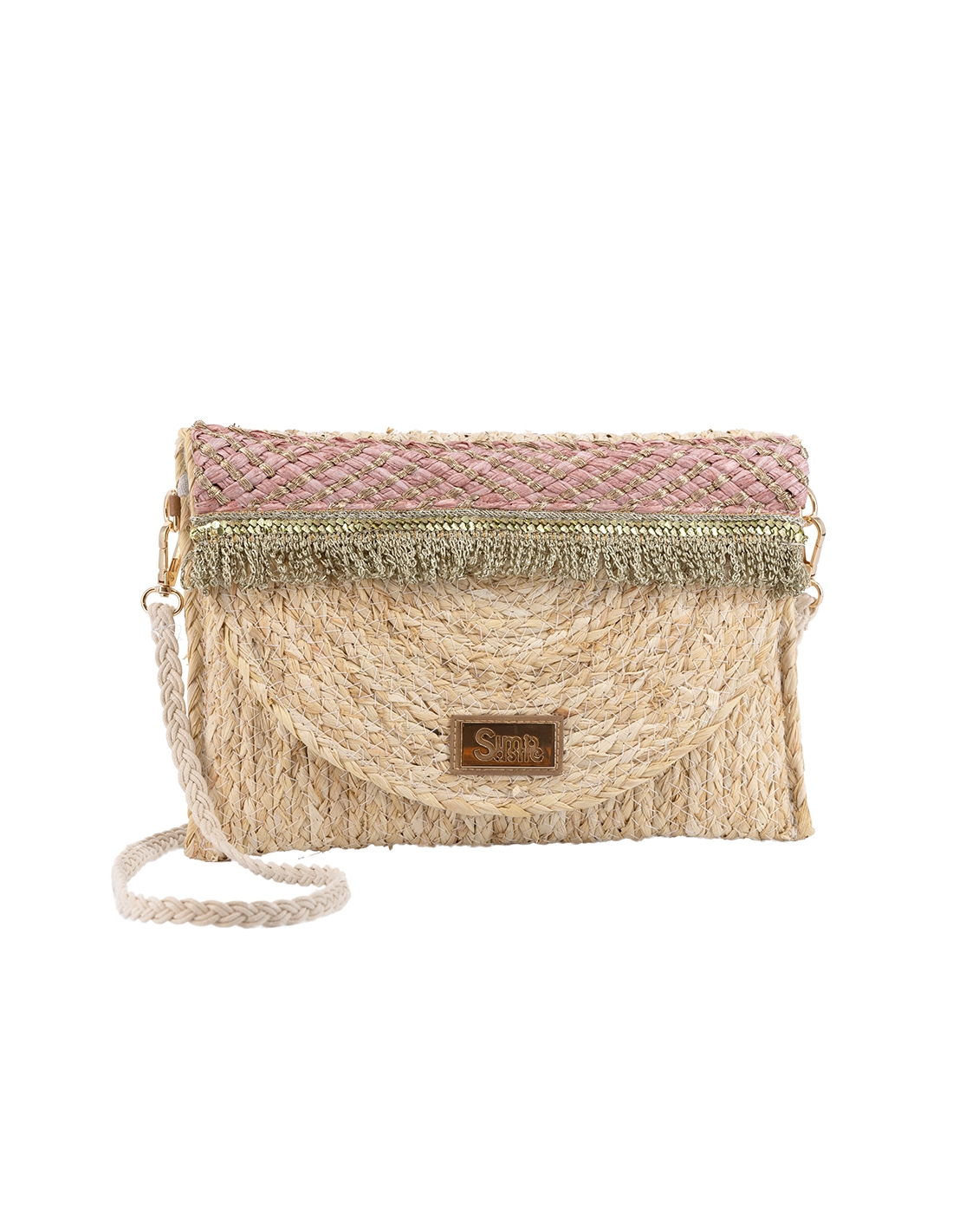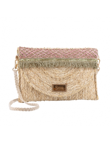 Bolso cartera fabricado en yute, con cierre de cremallera en yute, forro interior de algodón con bolsillo interior, asa estilo tote y asa bandolera de yute, trenzado en rosa y dorado, acabado con fleco estilo pom pon en oro y logo en dorado.