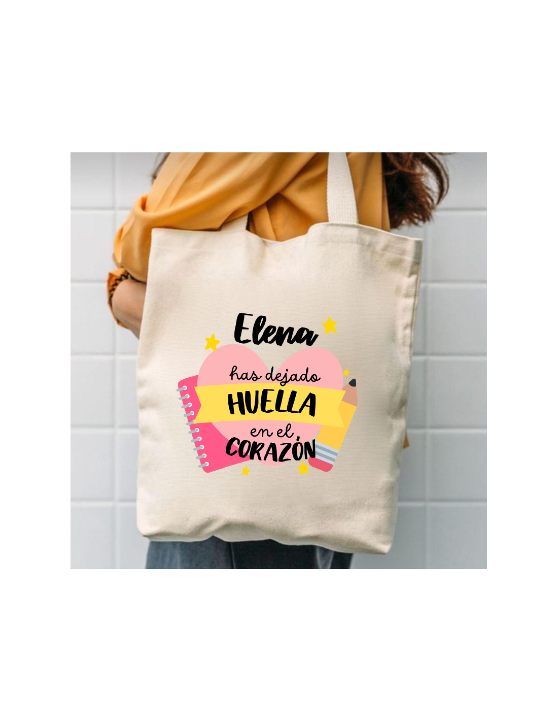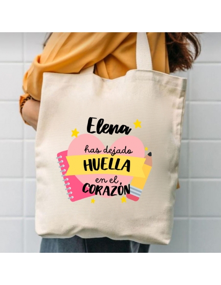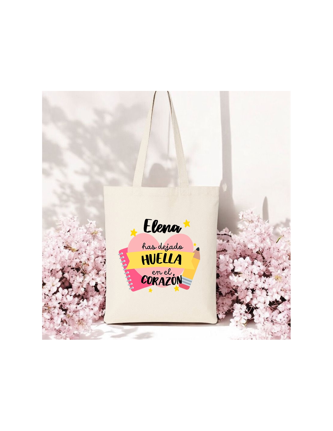 Bolsa niños, personalizada con el nombre de la profesora, mensaje, has dejado huella en el corazón (1 pc).