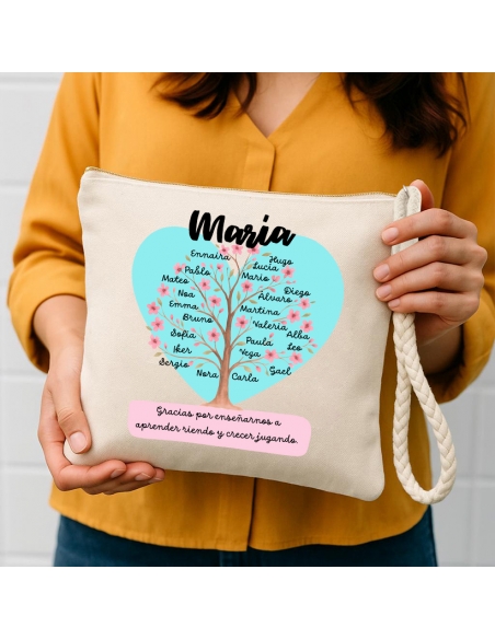 Un detalle pequeño, práctico y lleno de emoción: este neceser de algodón 100% natural es el regalo ideal para agradecer a una profe todo su cariño durante el curso. Con tamaño 26 cm ancho x 4 cm de base x 22 cm alto, es perfecto para llevar artículos personales, maquillaje, material escolar o lo que necesite en su día a día.