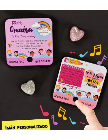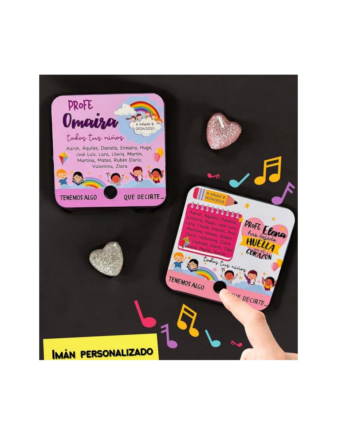 Este imán musical es mucho más que un detalle: es un recuerdo sonoro y visual lleno de cariño, diseñado especialmente para sorprender y emocionar a esa profe que ha dejado huella. Ideal como regalo de fin de curso, combina una canción personalizada, una carátula ilustrada con nombres y un formato decorativo y funcional.