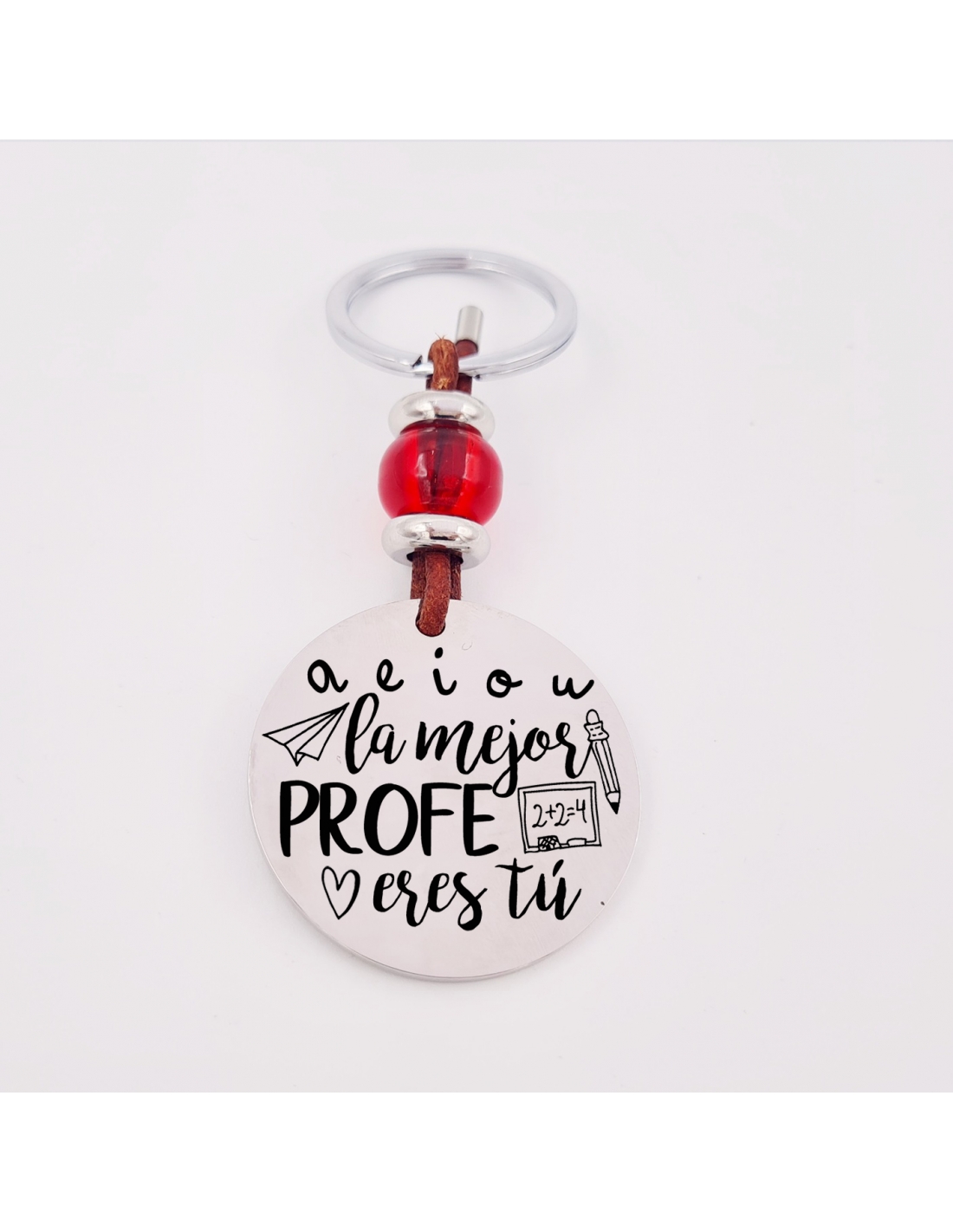 Llavero modelo BUBLE, (a, e, i, o, u la mejor profe eres tu) bola de vidrio, acero inoxidable.