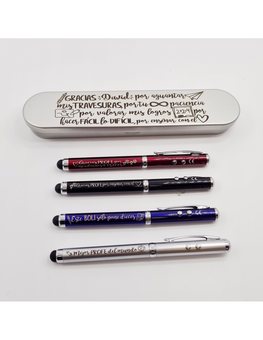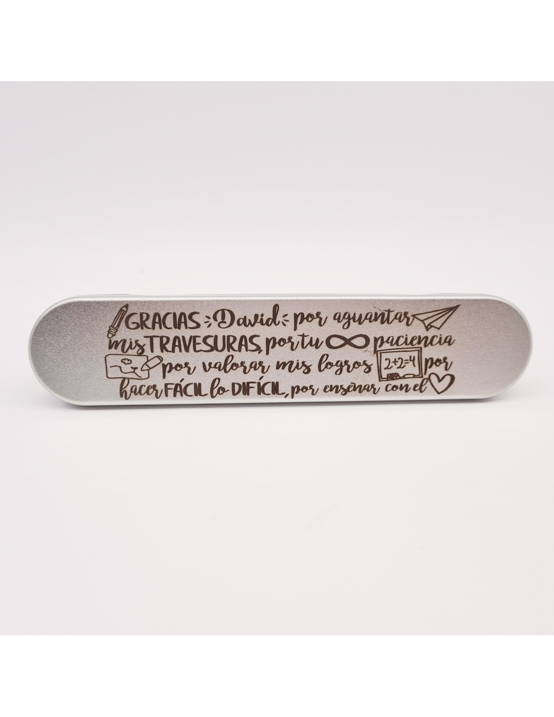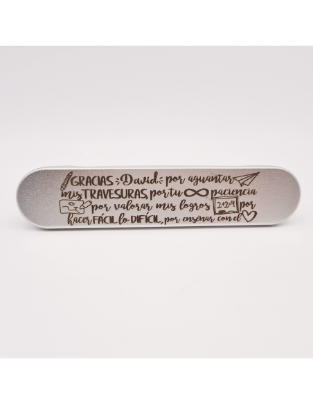 INCLUYE ESTUCHE DE METAL A JUEGO: GRACIAS (NOMBRE DEL PROFESOR) POR AGUANTAR MIS TRAVESURAS, POR TU INFINITA PACIENCIA, POR VALORAR MIS LOGROS, POR HACER FÁCIL LO DIFICIL, POR ENSEÑAR CON EL CORAZÓN.