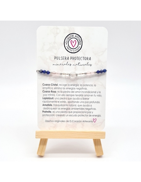 Pulsera Protectora, Cuarzo Cristal, Cuarzo Rosa, Lapislázuli, Amatista, Prenhita, combinación de piedras energéticas, ajustable.